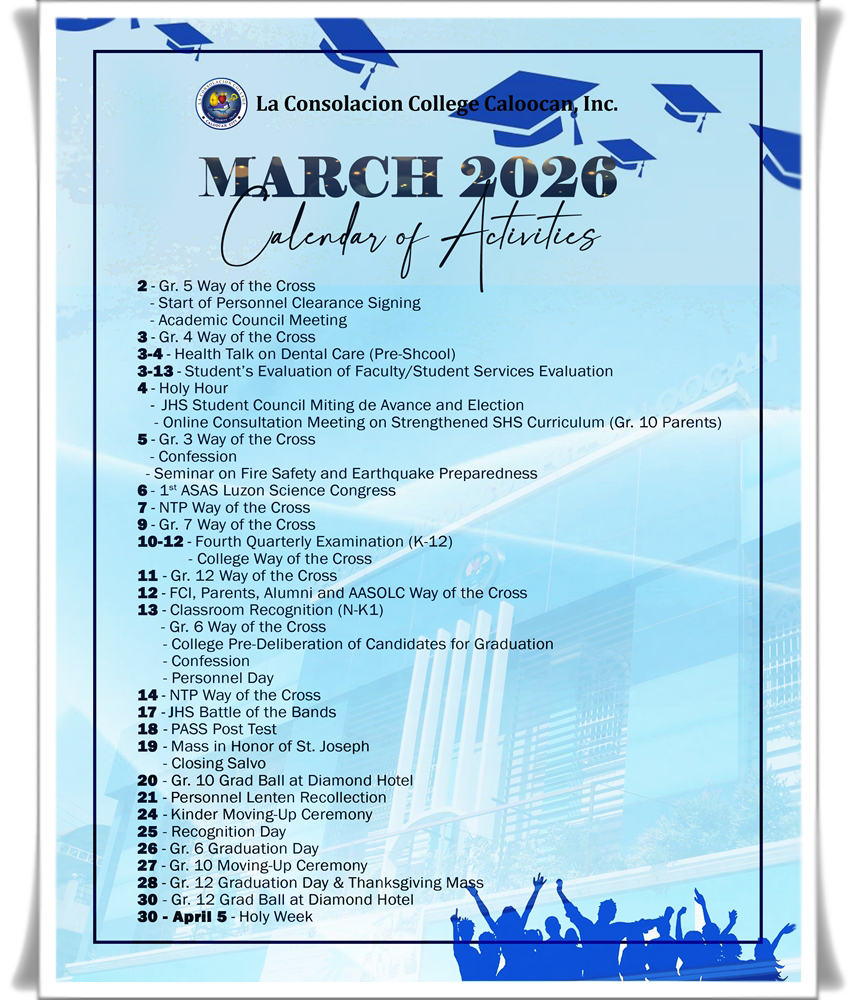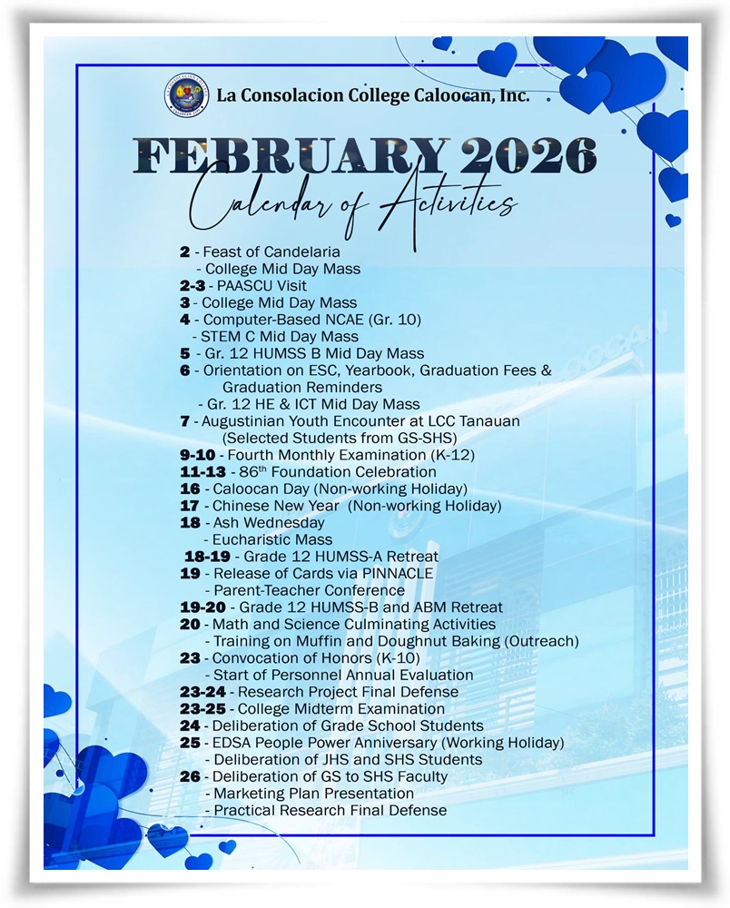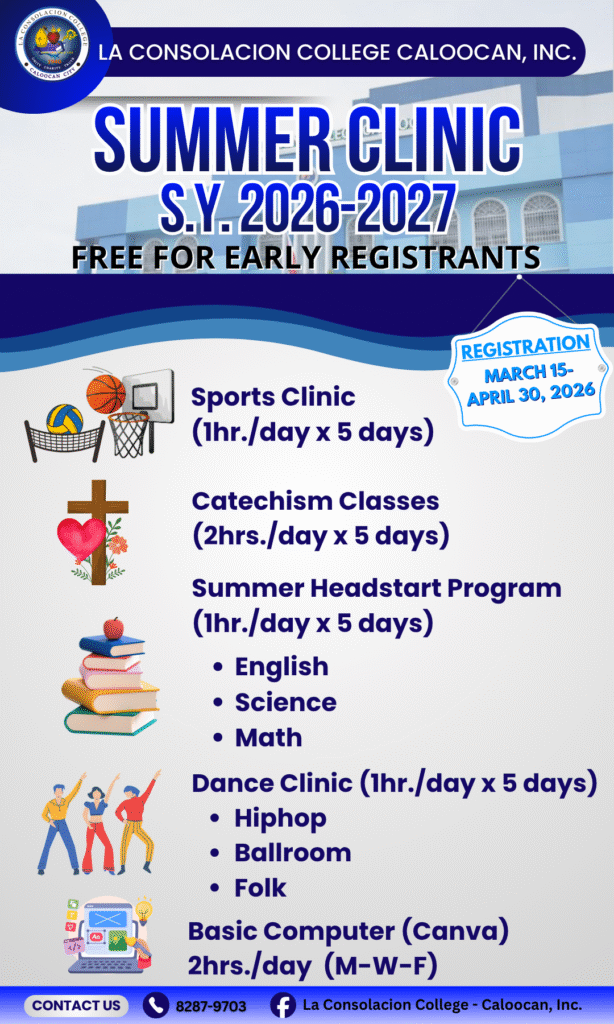 Established in 1940, La Consolacion College - Caloocan formerly known as St. Joseph Catholic School remains steadfast in bringing quality Christian education to many young people who seek to find a good foundation for their future and will continue to strive and be of service to its local and larger community.